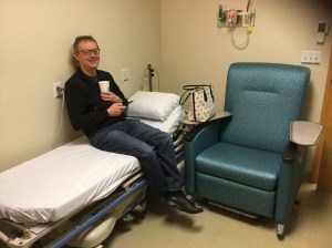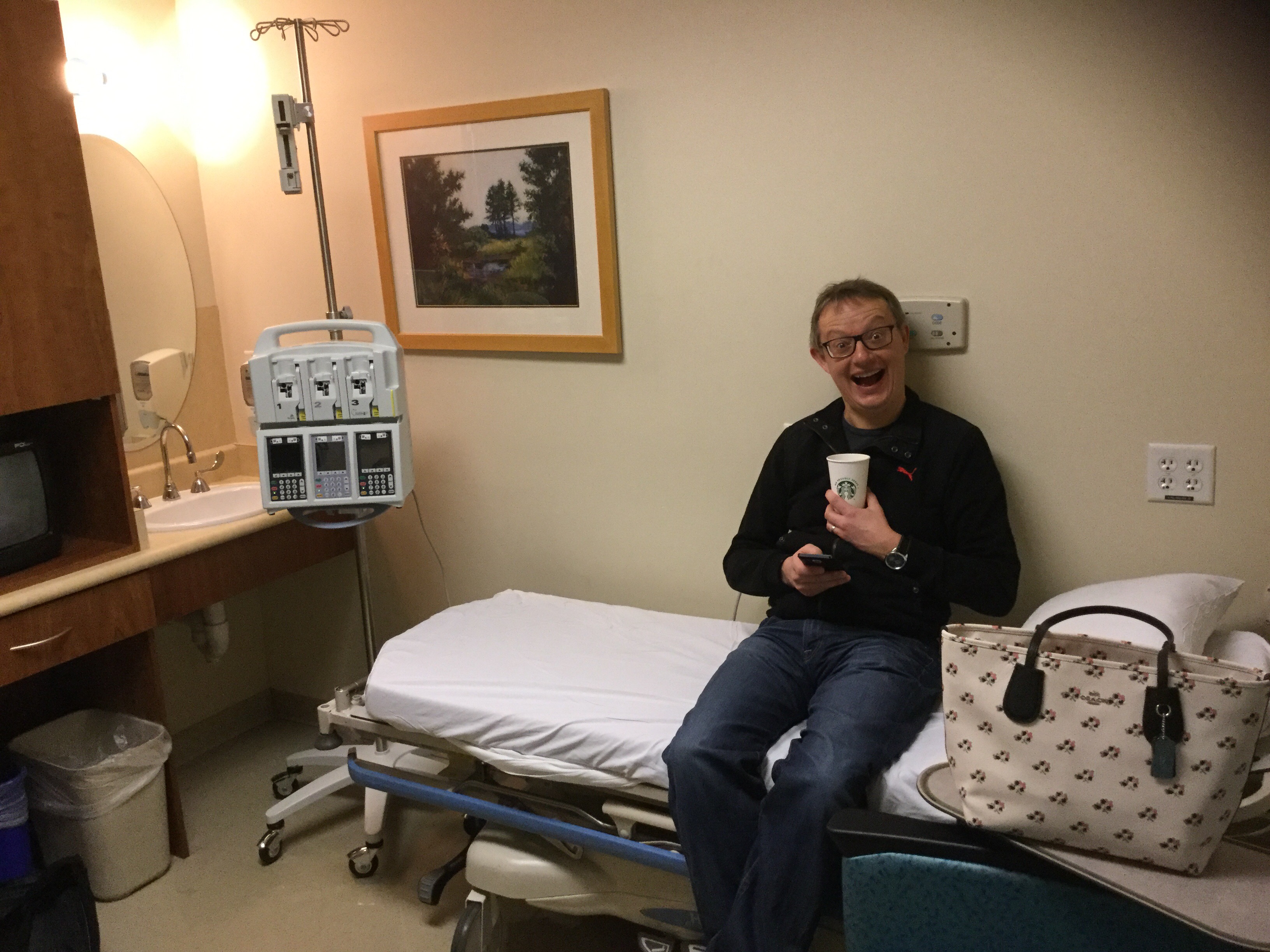 So I cheered up and we came down for the chemo. Last week the place was so full and we waited SO long. This week we waited maybe five minutes and have an awesome chemo nurse, Lauren, whom I love.